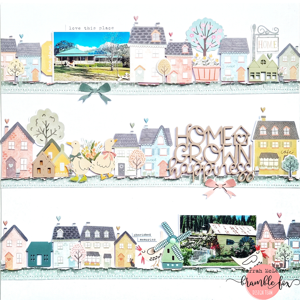 This layout was inspired by my friend Michelle Stokes and with her permission I created a whimsical village scene with rows of adorable houses lining the top and bottom borders like a storybook neighbourhood. Pastel pinks, blues, yellows, and greens pop against the clean white background, dotted with sweet details including acrylic houses and fussy cut ones from Paper Snips #88. Two treasured photos—one of a peaceful rural home under a blue sky, the other nestled among evergreens—anchor the page, capturing that "love this place" feeling perfectly.